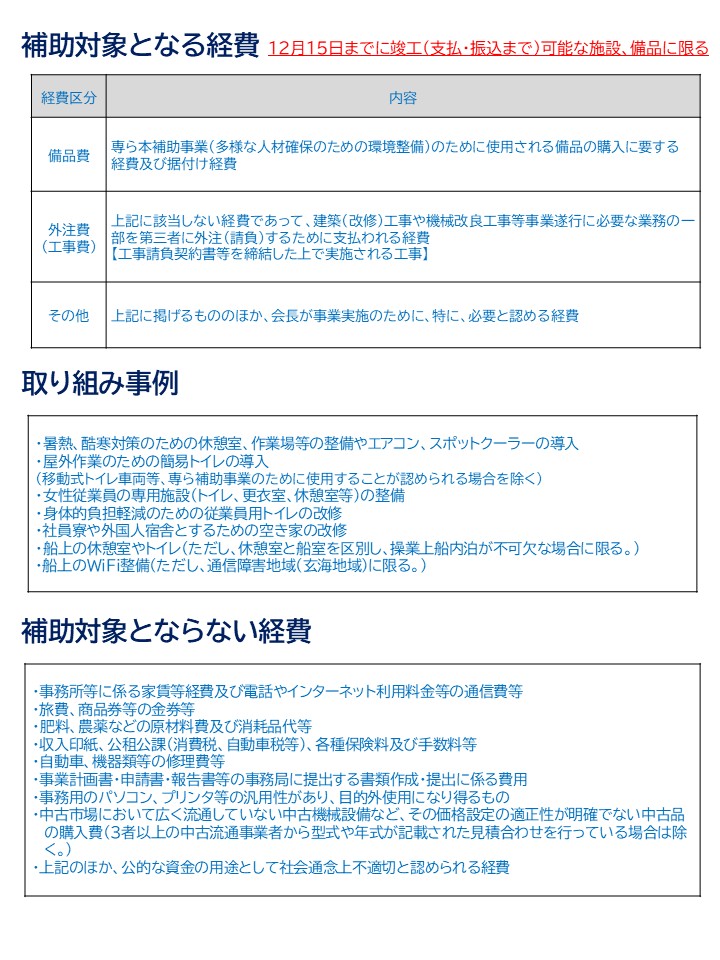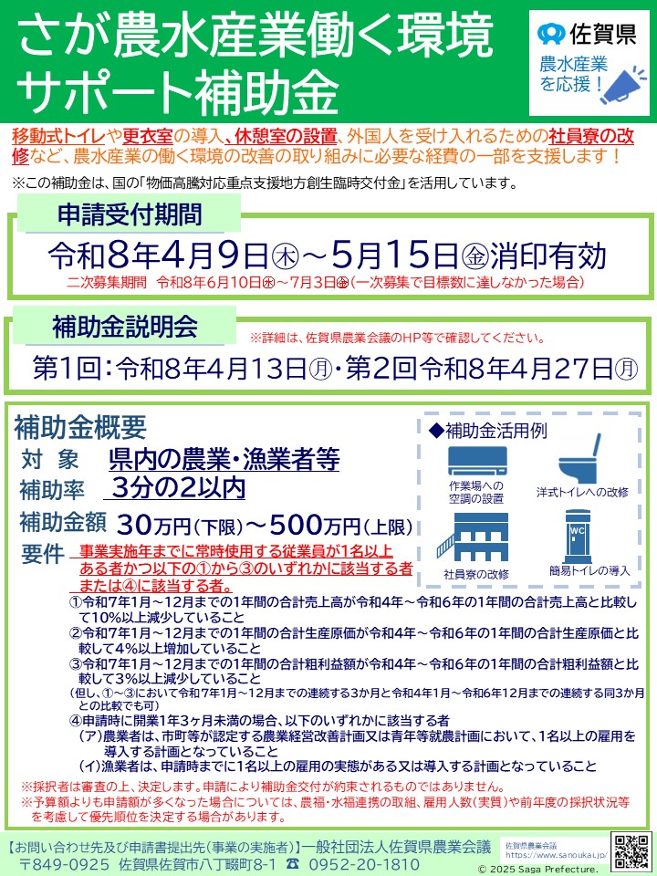 移動式トイレや更衣室の導入、休憩室の設置、社員寮の改修など、農水産業者の職場環境の整備を支援し、人材の確保及び定着を図るため、「さが農水産業働く環境サポート補助金」の申請を受付けます。